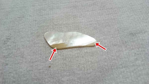 安物のパールは成型しておらず、貝の端っこなので矢印のようにキラキラじゃない部分が多かったりして表面に出てきちゃったりしますしねえ・・・。