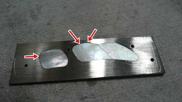 またまた順番を変更しまして、ステンの厚みも3ミリから4ミリに上げました。それによって、インレイの溝も3ミリ深になり、パールの厚みも大幅に上げることができました。