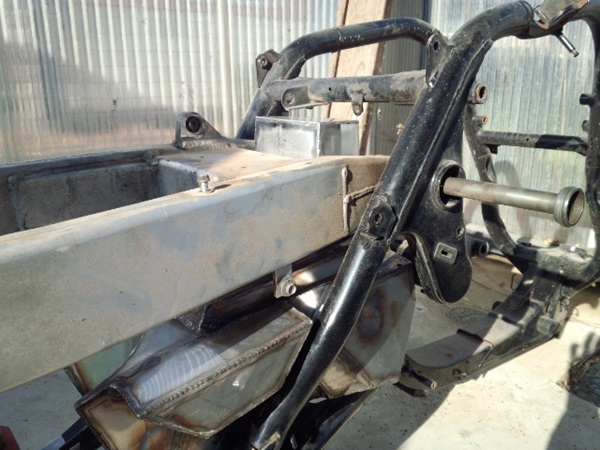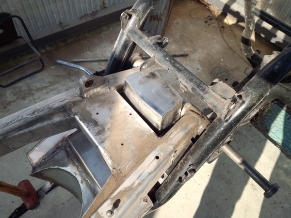 この部分は万が一、スイングアームと干渉する危険がありますので、強度マシのためアングルで溶接してます。
